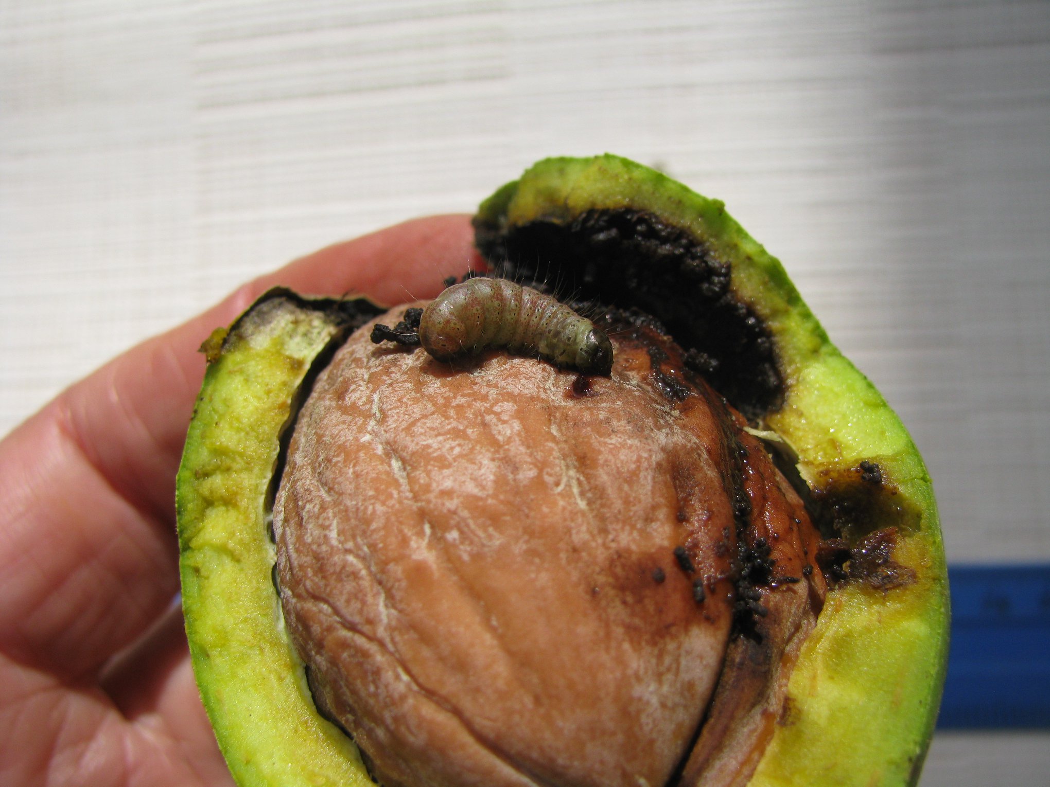 — Горіхові сади атакує страшний новий шкідник (він був уже давно, але таку шкодочинність бачу вперше) — горіхова плодожерка (Laspeyresia pomonella L. f. putaminana Stg.)… Таке враження, що їй уже надоїла яблуня, слива, груша, а тепер вона кинулася “закусити” гірким навколоплідником горіха волоського. Від її “діяльності” у цьому році до 30% гнилих горіхів… Що робити?…Вилазити та багаторазово обприскувати високі 10 метрові горохові дерева — нереально!,
