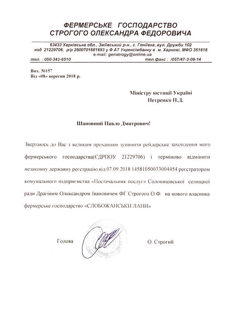 «Обращаюсь к Вам с большой просьбой остановить рейдерский захват моего фермерского хозяйства (ЕГРПОУ 21229706) и срочно отменить незаконное государственной регистрации».