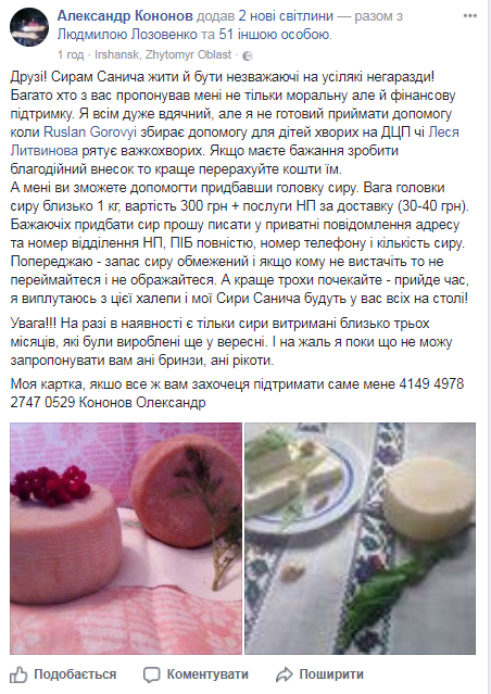 Фермер з Житомирщини Олександр Кононов, у якого нещодавно віджали ферму, пропонує купити у нього сири. Ціна – дуже навіть невелика, пише “Агро-Центр”.