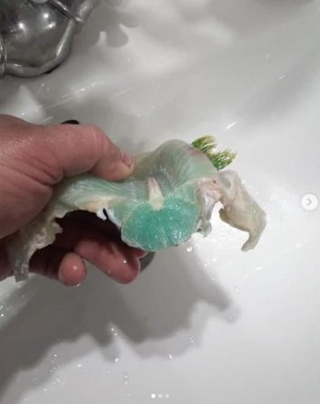 Деталі: Коли приніс додому, то виявив, що зелене не лише зовнішнє забарвлення риби, а й внутрішня частина. Тож опублікував світлину в Інстаграмі та запитав користувачів соцмереж чи це нормально.